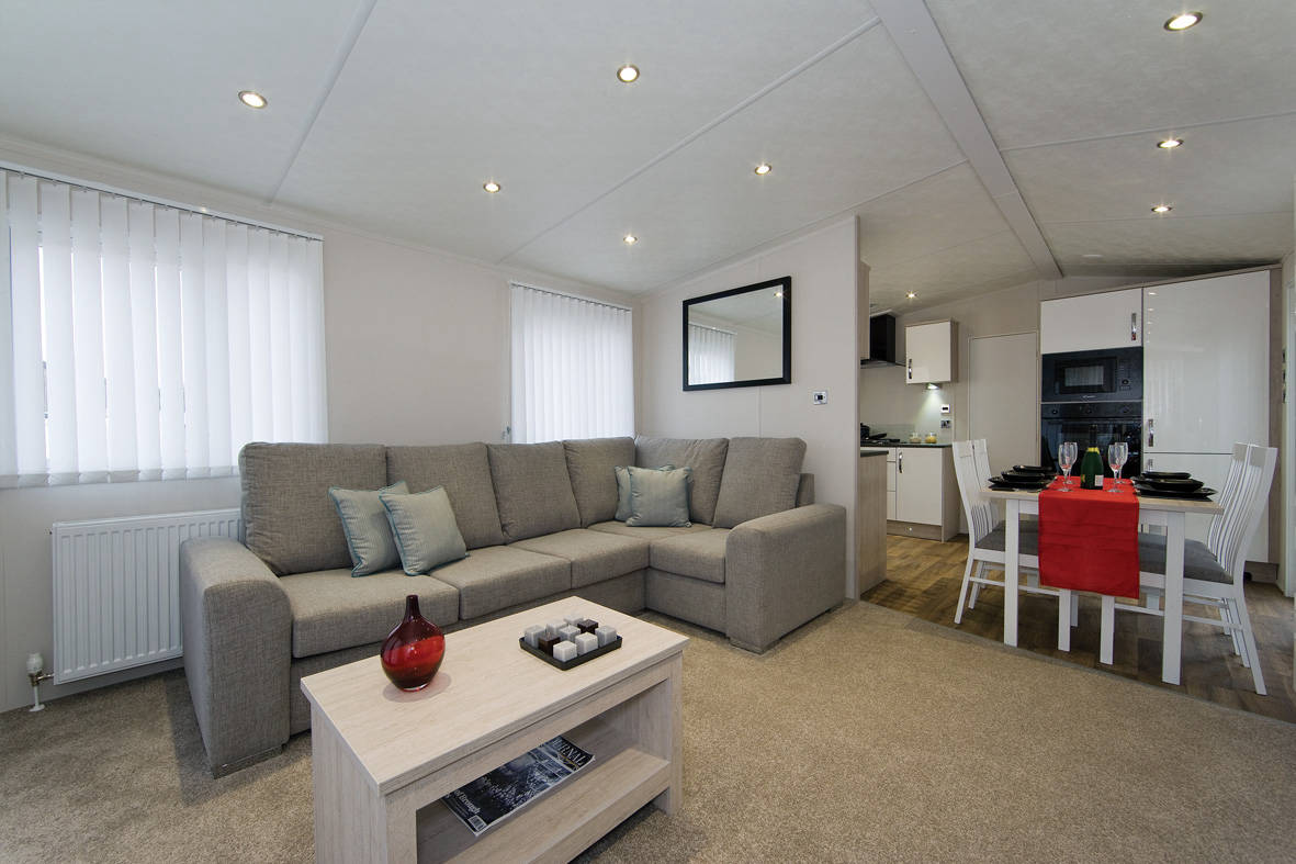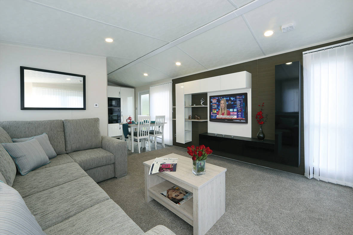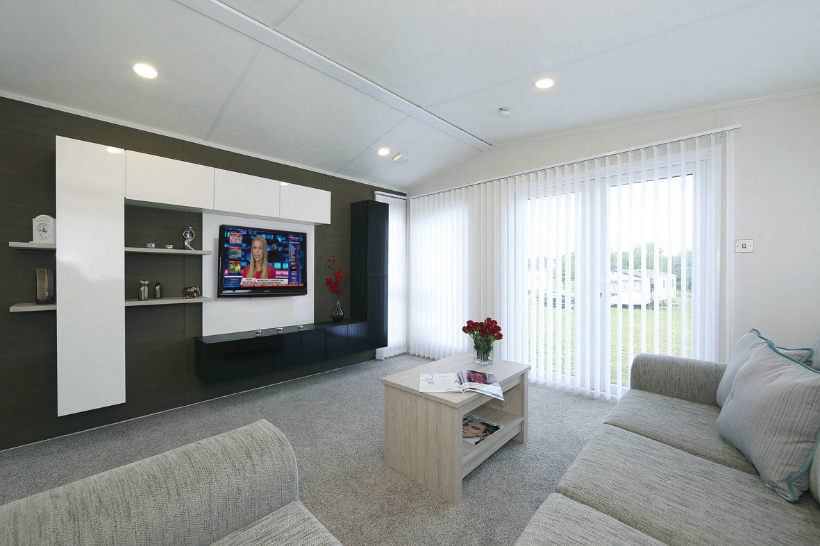 The Hadley static caravan it’s inviting open plan lounge with outlook front doors gives the holiday home owner everything needed from a quality holiday home. There is a large ‘L’ shape suite incorporating a fold out occasional bed and co-ordinated scatter cushions. The bedrooms include plush curtains and headboards , modern furniture design with a high gloss finish. The Kitchen with its high gloss finish , led plinth lights and matching black appliances gives a modern look with a great amount of cooking space. The Hadley with the unique modern design will bring the modern home into your holiday home and at an affordable price.