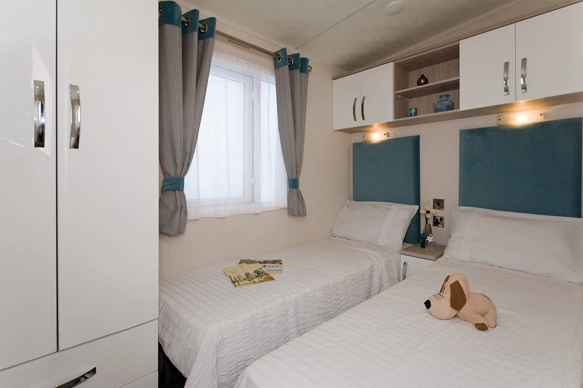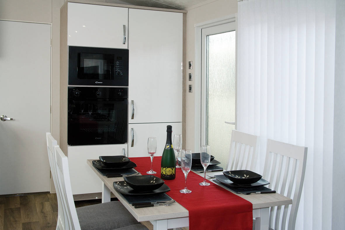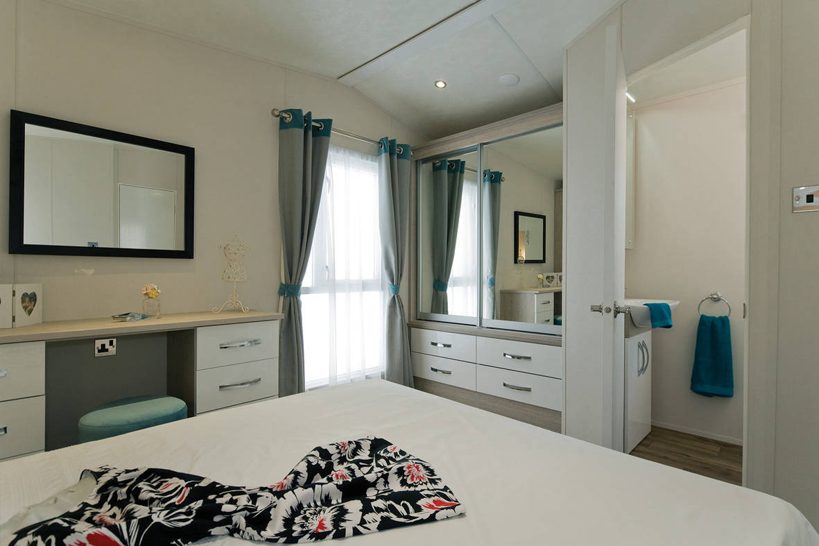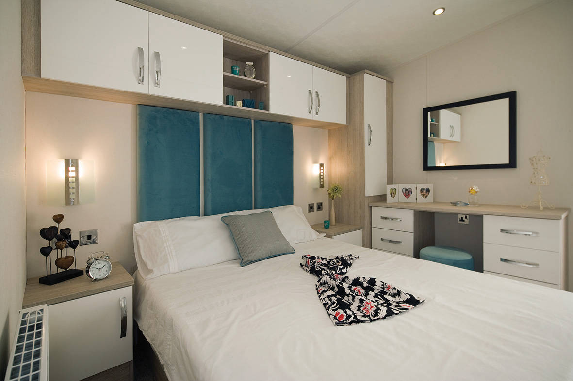 The Hadley static caravan it’s inviting open plan lounge with outlook front doors gives the holiday home owner everything needed from a quality holiday home. There is a large ‘L’ shape suite incorporating a fold out occasional bed and co-ordinated scatter cushions. The bedrooms include plush curtains and headboards , modern furniture design with a high gloss finish. The Kitchen with its high gloss finish , led plinth lights and matching black appliances gives a modern look with a great amount of cooking space. The Hadley with the unique modern design will bring the modern home into your holiday home and at an affordable price.
